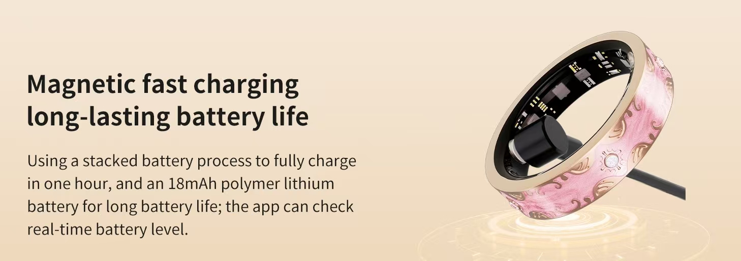 1. Main Chip: Zhongke - Ultra-low power consumption, longer battery life2. Battery: 18mA3. Bluetooth: 5.14. Charging Method: Magnetic charging, with charging case5. Waterproof Rating: IP686. Charging Time: 1 hour; Standby Time: 7-10 days; Usage Time: 5-7 days8. APP Supported Languages: Multiple languages#7 (Inner diameter 17.3mm) #8 (Inner diameter 18.2mm) #9 (Inner diameter 19.0mm) #10 (Inner diameter 19.9mm) Thickness: 2.9mmPackaging Size: 90*80*36mm; Single unit weight (without charging case): 75g; Single unit weight (with charging case): 98g; Outer carton size: 425*395*198mm; 100 units per carton; Carton weight (with charging cable): 8.5KG; Carton weight (with charging case): 11kg -